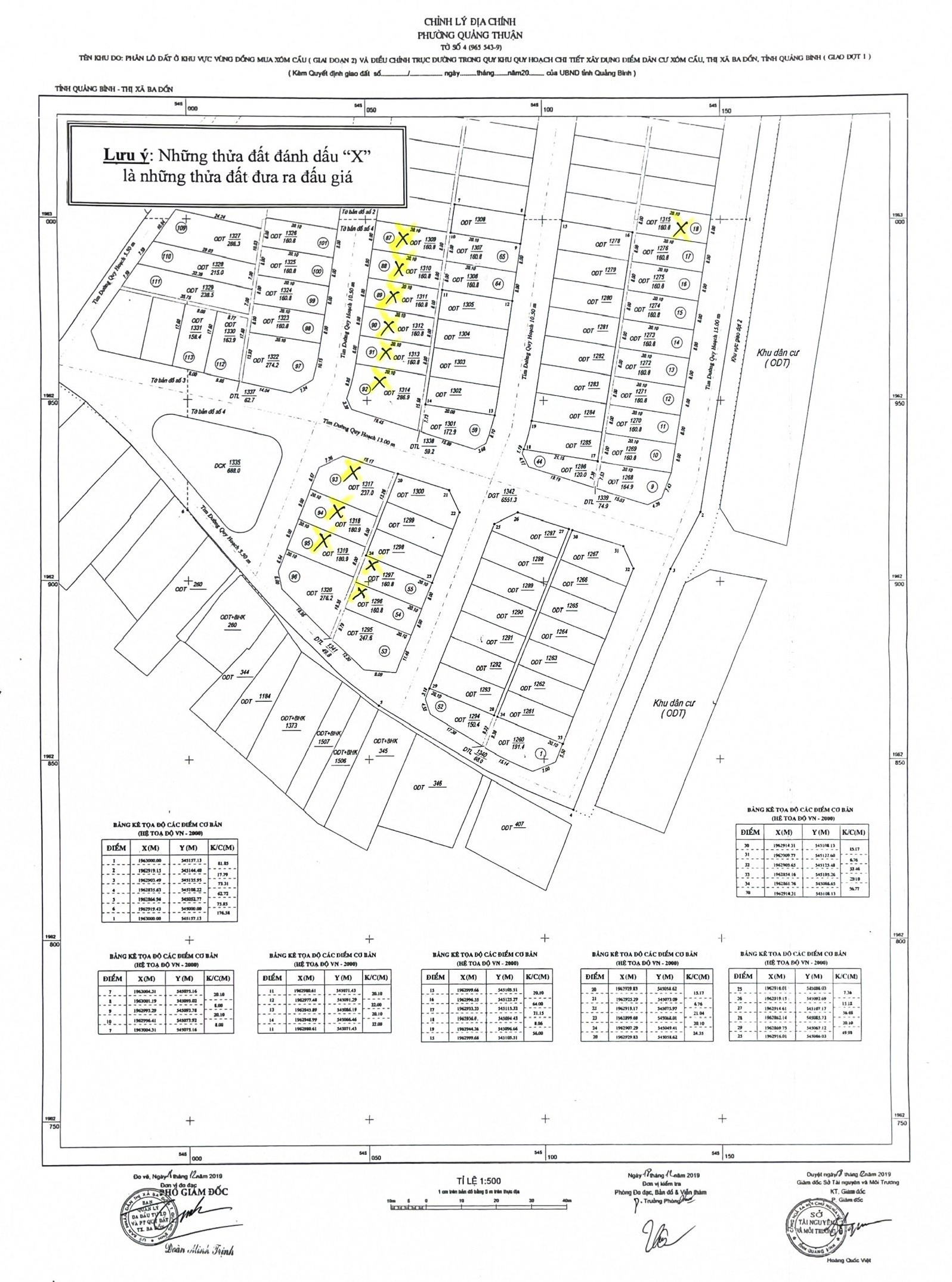 2.Người có tài sản đấu giá: Ban Quản lý Dự án Đầu tư xây dựng và Phát triển quỹ đất thị xã Ba Đồn. Địa chỉ: Số 04 đường Chu Văn An, thị xã Ba Đồn, tỉnh Quảng Bình. 3.Tài sản đấu giá: Quyền sử dụng đất đối với 41 thửa đất ở thuộc dự án Hạ tầng kỹ thuật khu dân cư Đồng Mua, phường Quảng Thuận, thị xã Ba Đồn, tỉnh Quảng Bình. -Diện tích từ 160,8 m2/thửa đến 286,9 m2/thửa. -Giá khởi điểm từ 746.000.000 đồng/thửa đến 1.623.000.000 đồng/thửa. -Địa chỉ các thửa đất: Phường Quảng Thuận, thị xã Ba Đồn, tỉnh Quảng Bình -Mục đích sử dụng đất: Đất ở tại đô thị (ODT). -Thời hạn sử dụng đất: Lâu dài. -Hình thức giao đất: Nhà nước giao đất có thu tiền sử dụng đất thông qua hình thức đấu giá quyền sử dụng đất. (Giá khởi điểm trên chưa bao gồm lệ phí trước bạ, phí, lệ phí và các chi phí khác phục vụ cho việc kê khai đăng ký quyền sử dụng đất và cấp giấy chứng nhận quyền sử dụng đất theo quy định hiện hành của Nhà nước) 4. Điều kiện, cách thức đăng ký tham gia đấu giá: Hộ gia đình, cá nhân thuộc đối tượng được Nhà nước giao đất có thu tiền sử dụng đất theo quy định của Luật Đất đai, có nhu cầu sử dụng đất để làm nhà ở theo quy hoạch đã được cơ quan Nhà nước có thẩm quyền phê duyệt, chấp hành tốt pháp luật đất đai thực hiện đăng ký tham gia đấu giá thông qua việc nộp hồ sơ tham gia đấu giá hợp lệ cho Trung tâm Dịch vụ đấu giá tài sản tỉnh Quảng Bình; Không thuộc đối tượng không được đăng ký tham gia đấu giá. 5. Thời gian, địa điểm thực hiện các thủ tục đăng ký tham gia đấu giá: a) Thời gian tham khảo hồ sơ, bán hồ sơ, đăng ký và tiếp nhận hồ sơ đăng ký tham gia đấu giá: Từ 07 giờ 30 phút ngày 13/11/2023 đến 16 giờ 30 phút ngày 01/12/2023. - Địa điểm tham khảo hồ sơ, bán hồ sơ: Tại trụ sở Trung tâm Dịch vụ đấu giá tài sản tỉnh Quảng Bình và UBND phường Quảng Thuận, thị xã Ba Đồn, tỉnh Quảng Bình. - Địa điểm đăng ký và tiếp nhận hồ sơ đăng ký tham gia đấu giá: Tại trụ sở UBND phường Quảng Thuận, thị xã Ba Đồn, tỉnh Quảng Bình. b) Thời gian, địa điểm xem tài sản: Vào ngày 27/11/2023 và ngày 28/11/2023 tại vị trí thửa đất đưa ra đấu giá. Người đăng ký tham gia đấu giá có nhu cầu liên hệ với Trung tâm Dịch vụ đấu giá tài sản để sắp xếp, bố trí thời gian đi xem tài sản, số điện thoại liên hệ: 02323.533568. c) Thời gian nộp tiền đặt trước, nộp phiếu trả giá: Từ 07 giờ 30 phút ngày 29/11/2023 đến 16 giờ 30 phút ngày 01/12/2023. - Mức thu tiền đặt trước: Nộp 20% giá khởi điểm của thửa đất đăng ký. Tiền đặt trước nộp vào tài khoản số 122 000 000 389 của Trung tâm Dịch vụ đấu giá tài sản tỉnh Quảng Bình mở tại Ngân hàng TMCP Công thương Việt Nam - CN Quảng Bình (Vietinbank) - Địa điểm nộp phiếu trả giá: Tại trụ sở UBND phường Quảng Thuận, thị xã Ba Đồn, tỉnh Quảng Bình. (Các thủ tục trên được thực hiện trong giờ hành chính các ngày làm việc) 6. Thời gian, địa điểm tổ chức buổi công bố giá đã trả: Vào lúc 14 giờ 00 phút ngày 04/12/2023 tại Hội trường UBND phường Quảng Thuận, thị xã Ba Đồn, tỉnh Quảng Bình. Mọi chi tiết xin liên hệ Trung tâm Dịch vụ đấu giá tài sản, Số điện thoại: 0232.3533568; Website: https://daugia.quangbinh.gov.vn. Lý do điều chỉnh: Căn cứ Công văn số 469/BQLDA ngày 14/11/2023 của Ban Quản lý Dự án Đầu tư xây dựng và Phát triển quỹ đất thị xã Ba Đồn v/v đề nghị dừng đấu giá đối với thửa đất số 1306, thửa đất số 1307 TBĐ số 4 thuộc dự án: Hạ tầng kỹ thuật khu dân cư Đồng Mua phường Quảng Thuận, thị xã Ba Đồn, tỉnh Quảng Bình, lý do: Qua quá trình kiểm tra thực địa, 02 thửa đất trên chưa đảm bảo để đưa ra đấu giá theo quy định. ĐỊNH VỊ: Xem tại đây PHỤ LỤC 41 THỬA:
