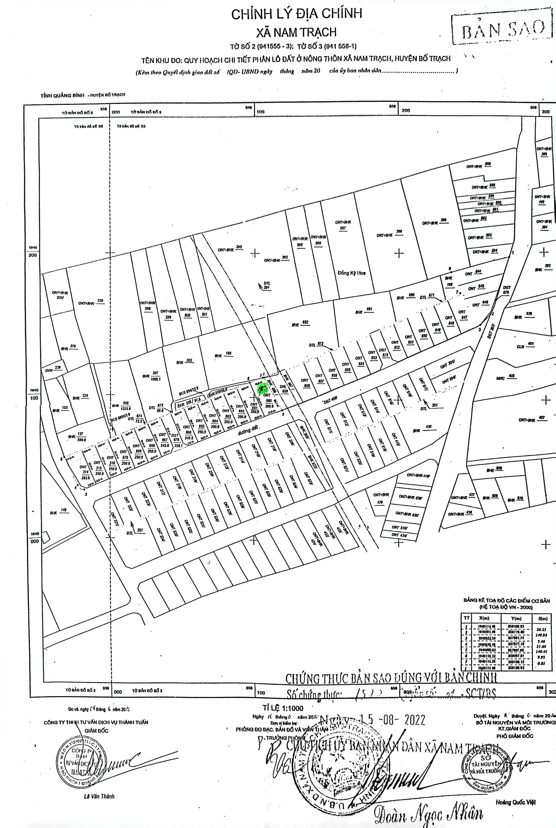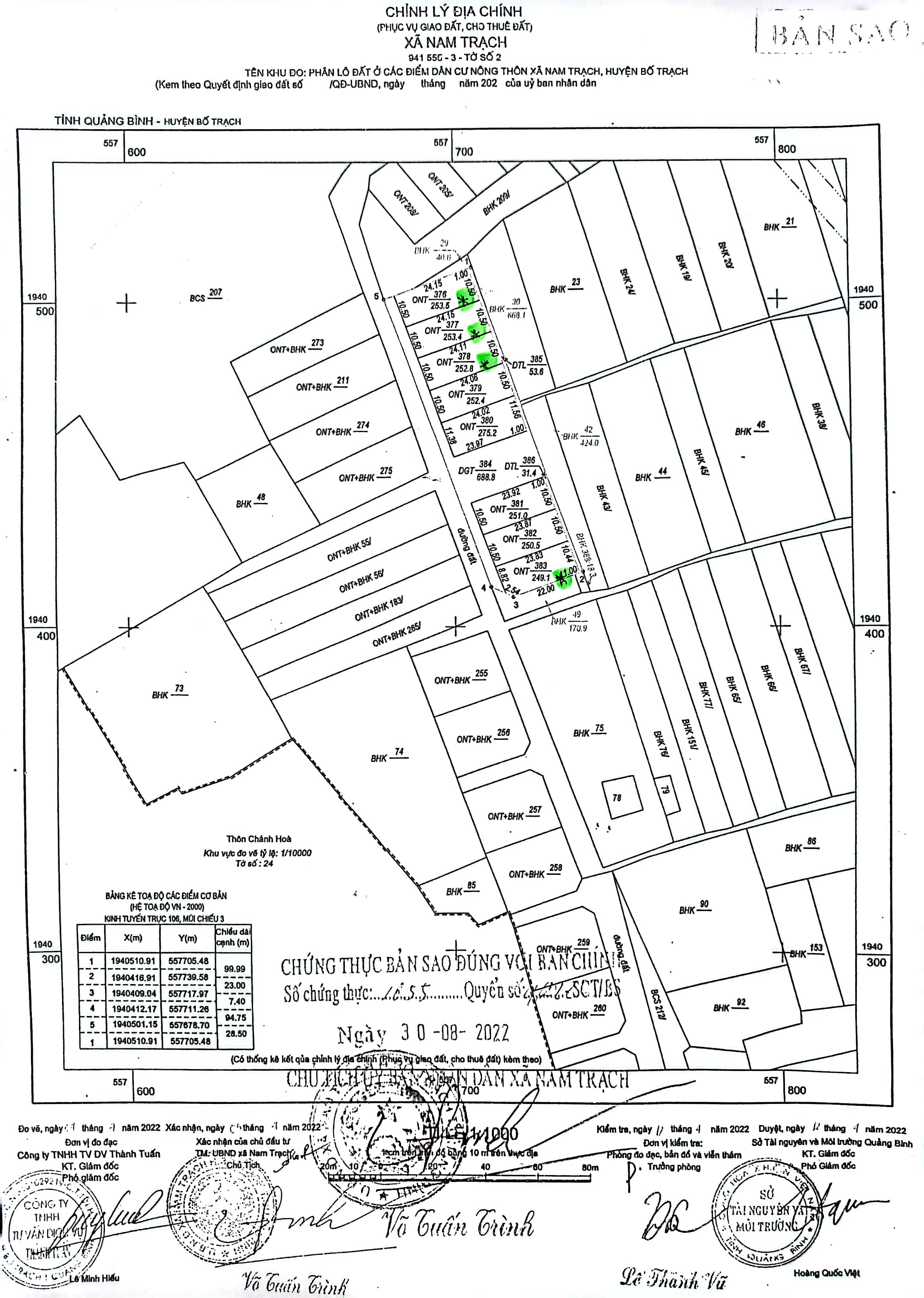 2. Tổ chức có quyền đưa tài sản ra đấu giá: Ban quản lý dự án Đầu tư xây dựng và Phát triển quỹ đất huyện Bố Trạch. Địa chỉ: Đường Nguyễn Tất Thành, tiểu khu 3, thị trấn Hoàn Lão, huyện Bố Trạch, tỉnh Quảng Bình. 3. Tài sản đấu giá: Quyền sử dụng đất ở đối với 05 thửa đất tại xã Nam Trạch, huyện Bố Trạch, tỉnh Quảng Bình; Diện tích từ 249,1m2/thửa đến 300,5m2/thửa; Giá khởi điểm từ 601.000.000 đồng/thửa đến 653.000.000 đồng/thửa. Diện tích đất, vị trí, giá khởi điểm của từng thửa đất và các thông tin liên quan được niêm yết tại trụ sở Trung tâm Dịch vụ đấu giá tài sản tỉnh Quảng Bình, Ban quản lý dự án Đầu tư xây dựng và Phát triển quỹ đất huyện Bố Trạch và UBND xã Nam Trạch. 4. Tiền đặt trước: Nộp từ 15% đến 20% trên giá khởi điểm của thửa đất đăng ký. 5. Điều kiện, cách thức đăng ký tham gia đấu giá tài sản: Hộ gia đình, cá nhân thuộc đối tượng được Nhà nước giao đất có thu tiền sử dụng đất theo quy định của Luật Đất đai, nộp hồ sơ tham gia đấu giá hợp lệ tại trụ sở của Ban quản lý dự án Đầu tư xây dựng và Phát triển quỹ đất huyện Bố Trạch. 6. Thời gian, địa điểm thực hiện các thủ tục đấu giá tài sản: - Thời gian, địa điểm tham khảo, bán hồ sơ, đăng ký tham gia đấu giá và bỏ phiếu trả giá: Từ ngày 24/5/2023 đến 16h30’ ngày 09/6/2023 tại trụ sở của Ban quản lý dự án Đầu tư xây dựng và Phát triển quỹ đất huyện Bố Trạch. - Thời gian, địa điểm nộp tiền đặt trước: Từ ngày 07/6/2023 đến 16h30’ ngày 09/6/2023 vào tài khoản của Trung tâm Dịch vụ đấu giá tài sản tỉnh Quảng Bình mở tại Ngân hàng thương mại. (Các thủ tục trên được thực hiện trong giờ hành chính các ngày làm việc) - Thời gian, địa điểm buổi công bố kết quả trả giá: Vào lúc 14h00’ ngày 12/6/2023 tại UBND xã Nam Trạch, huyện Bố Trạch, tỉnh Quảng Bình. Mọi chi tiết xin liên hệ: Tại Trung tâm Dịch vụ đấu giá tài sản, điện thoại: 0232.3856585 (Gặp đ/c Phương); Ban quản lý dự án Đầu tư xây dựng và Phát triển quỹ đất huyện Bố Trạch và UBND xã Nam Trạch./. PHỤ LỤC 05 THỬA ĐÂT