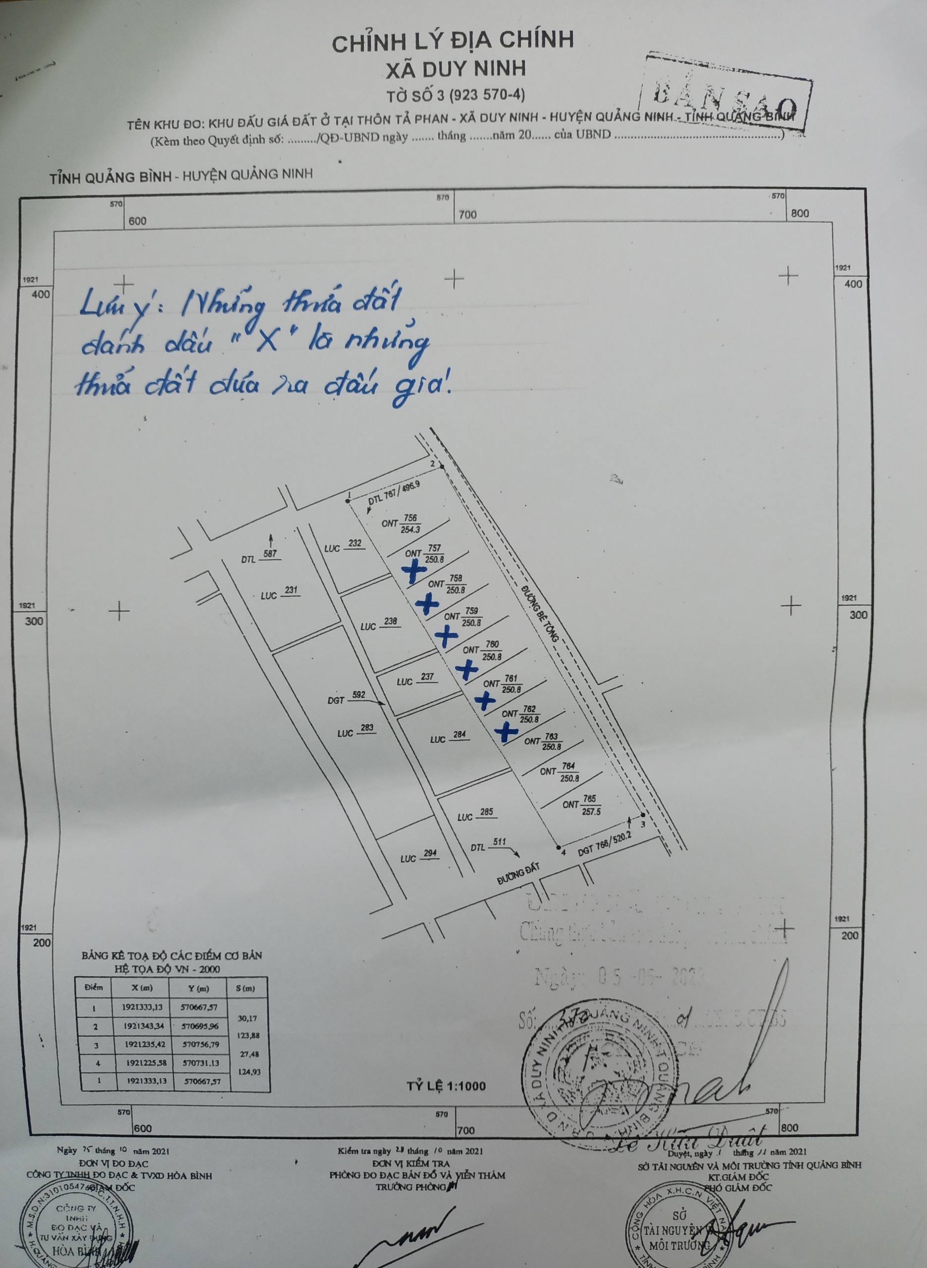 2. Người có tài sản đấu giá: Ban quản lý dự án Đầu tư xây dựng và Phát triển quỹ đất huyện Quảng Ninh, tỉnh Quảng Bình. Địa chỉ: Số 127, đường Nguyễn Hữu Cảnh, thị trấn Quán Hàu, huyện Quảng Ninh, tỉnh Quảng Bình. 3. Tài sản đấu giá: - Tài sản 01: Quyền sử dụng đất ở đối với 31 thửa đất tại xã Gia Ninh, huyện Quảng Ninh, tỉnh Quảng Bình. Diện tích từ 241,0 m²/thửa đến 597,5 m²/thửa. Giá khởi điểm từ 1.250.000.000 đồng/thửa đến 5.048.875.000 đồng/thửa. - Tài sản 02: Quyền sử dụng đất ở đối với 06 thửa đất tại xã Duy Ninh, huyện Quảng Ninh, tỉnh Quảng Bình. Diện tích 250,8 m²/thửa. Giá khởi điểm 613.000.000 đồng/thửa. - Tài sản 03: Quyền sử dụng đất ở đối với 63 thửa đất tại xã An Ninh, huyện Quảng Ninh, tỉnh Quảng Bình. Diện tích từ 256,5 m²/thửa đến 337,3 m²/thửa. Giá khởi điểm từ 508.000.000 đồng/thửa đến 730.000.000 đồng/thửa. Mục đích sử dụng: Đất ở tại nông thôn. Thời hạn sử dụng: Lâu dài. Hình thức giao đất: Nhà nước giao đất có thu tiền sử dụng đất. Giá khởi điểm các thửa đất đưa ra đấu giá chưa bao gồm lệ phí trước bạ, phí, lệ phí và các chi phí khác phục vụ cho việc kê khai đăng ký quyền sử dụng và cấp giấy chứng nhận quyền sử dụng đất theo quy định hiện hành của Nhà nước. Khách hàng đăng ký tham gia đấu giá phải chấp nhận tình trạng cơ sở hạ tầng hiện có. 4. Tiền đặt trước: 20% trên giá khởi điểm của từng thửa đất đăng ký đấu giá. 5. Điều kiện, cách thức đăng ký tham gia đấu giá tài sản: Hộ gia đình, cá nhân thuộc đối tượng được Nhà nước giao đất có thu tiền sử dụng đất, chấp hành tốt pháp luật đất đai, thực hiện nghiêm túc theo quy định của pháp luật và phương án đấu giá đã được cấp có thẩm quyền phê duyệt, trực tiếp nộp hồ sơ tham gia đấu giá hợp lệ cho Trung tâm Dịch vụ đấu giá tài sản tỉnh Quảng Bình tại trụ sở Ban quản lý dự án Đầu tư xây dựng và Phát triển quỹ đất huyện Quảng Ninh. 6. Thời gian, địa điểm thực hiện các thủ tục đấu giá: - Thời gian tham khảo, bán hồ sơ, tiếp nhận hồ sơ, đăng ký tham gia đấu giá: Từ ngày 31/10/2023 đến 16h30/ ngày 17/11/2023. - Thời gian bỏ phiếu trả giá và nộp tiền đặt trước vào tài khoản của Trung tâm Dịch vụ đấu giá tài sản tỉnh Quảng Bình: Từ ngày 15/11/2023 đến 16h30/ ngày 17/11/2023. - Thời gian tổ chức buổi công bố giá đã trả: Vào lúc 14h00/ ngày 20/11/2023. - Địa điểm tham khảo, bán hồ sơ tham gia đấu giá: Tại trụ sở Ban quản lý dự án Đầu tư xây dựng và Phát triển quỹ đất huyện Quảng Ninh và tại trụ sở Trung tâm Dịch vụ đấu giá tài sản tỉnh Quảng Bình. - Địa điểm tiếp nhận hồ sơ, đăng ký tham gia đấu giá, bỏ phiếu trả giá và tổ chức buổi công bố giá đã trả: Tại hội trường Ban quản lý dự án Đầu tư xây dựng và Phát triển quỹ đất huyện Quảng Ninh. Các thủ tục trên được thực hiện trong giờ hành chính các ngày làm việc. Mọi chi tiết xin liên hệ: Trung tâm Dịch vụ đấu giá tài sản tỉnh Quảng Bình, điện thoại: 0232.3856585 (Gặp đ/c Nhài). PHỤ LỤC 100 THỬA ĐẤT: Xem tại đây 31 THỬA ĐẤT GIA NINH: Định vị xem tại đây 06 THỬA ĐẤT DUY NINH: Định vị xem tại đây 63 THỬA ĐẤT AN NINH: Định vị xem tại đây